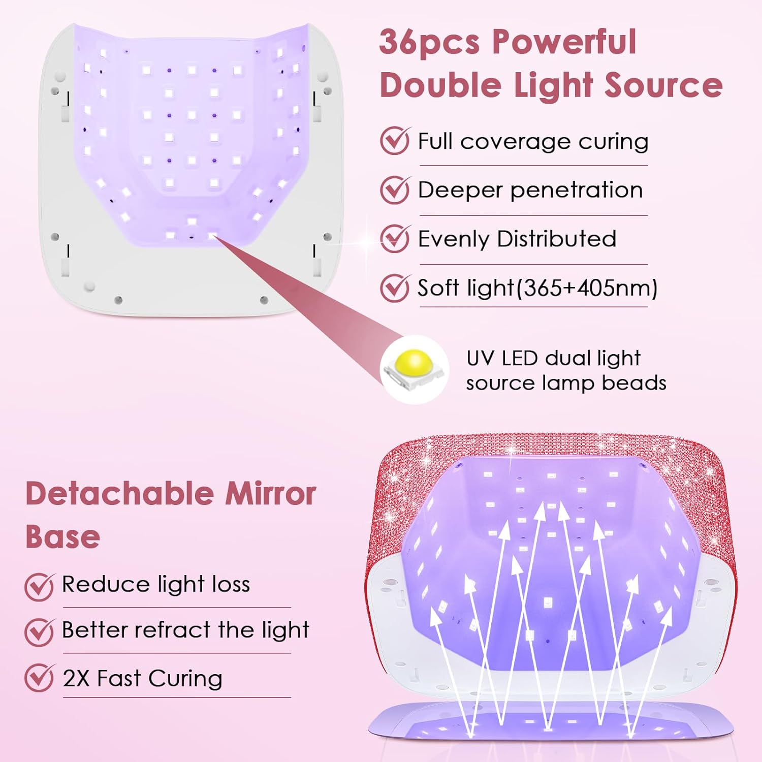 - 𝐒𝐩𝐚𝐫𝐤𝐥𝐢𝐧𝐠 𝐃𝐢𝐚𝐦𝐨𝐧𝐝 𝐃𝐞𝐬𝐢𝐠𝐧: This bling nail lamp is made of dazzling rhinestones that sparkle and shine! It boasts a beautiful appearance and unique design. The special sparkling diamond embellishment design not only enhances the beauty of the UV nail lamp, but also adds an eye-catching glow, perfect for creating delicate and sparkling nails.
