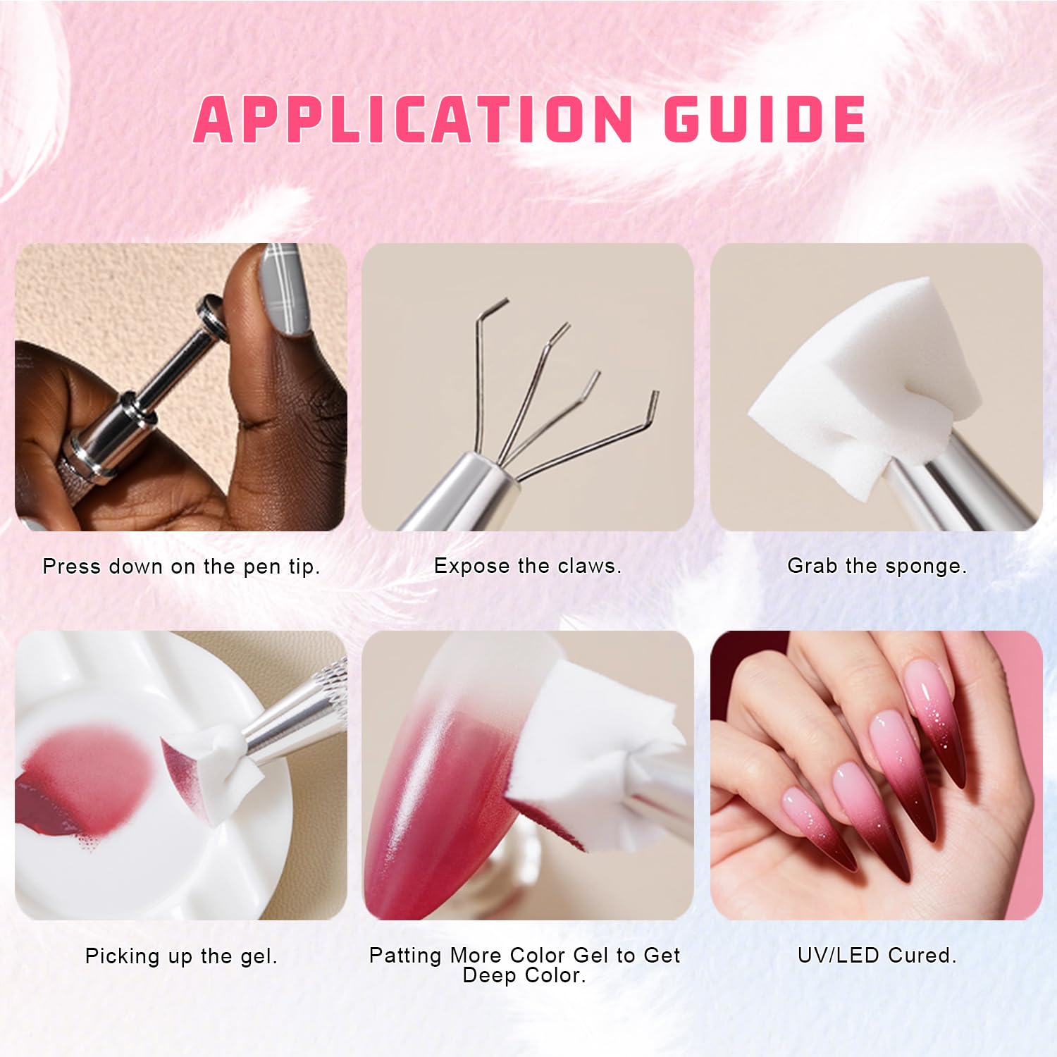 - 【EASY USE:】All steps are the same as normal UV/LED nail gel: 1.Clean and Prep; 2. Base coat and cure. 3. Apply color gel and cure. 4. Top coat and cure. 5. Clean nails and apply oil. Karroy ombre painting nail gel is easy to use: just grabbing a sponge and picking up your desire color, and patting sponge on your nail, you will get wonderful gradient coloring nails!
