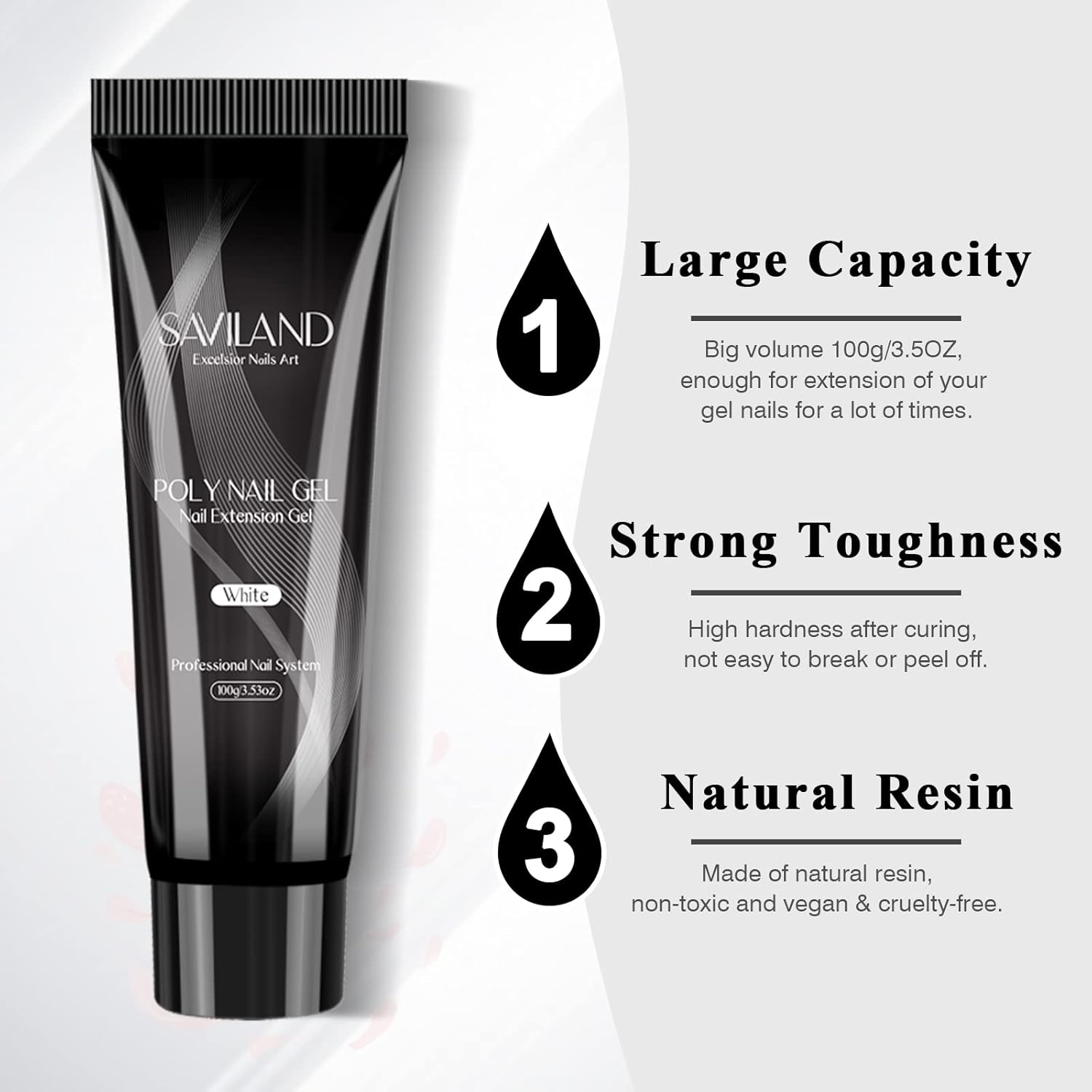 - š· SAVILAND WHITE POLY NAIL GEL-Saviland 100g/3.5oz white poly extension gel with popular classic color, can do nail extension, poly gel nails, nail enhancement, nail art, stick sequins or decorations, etc. 100g super large capacity, valuable, and long service life. It is very suitable for professional nail salons and nail lovers who often make extension. Can mix with other colorful gel to create various and attractive nail art.