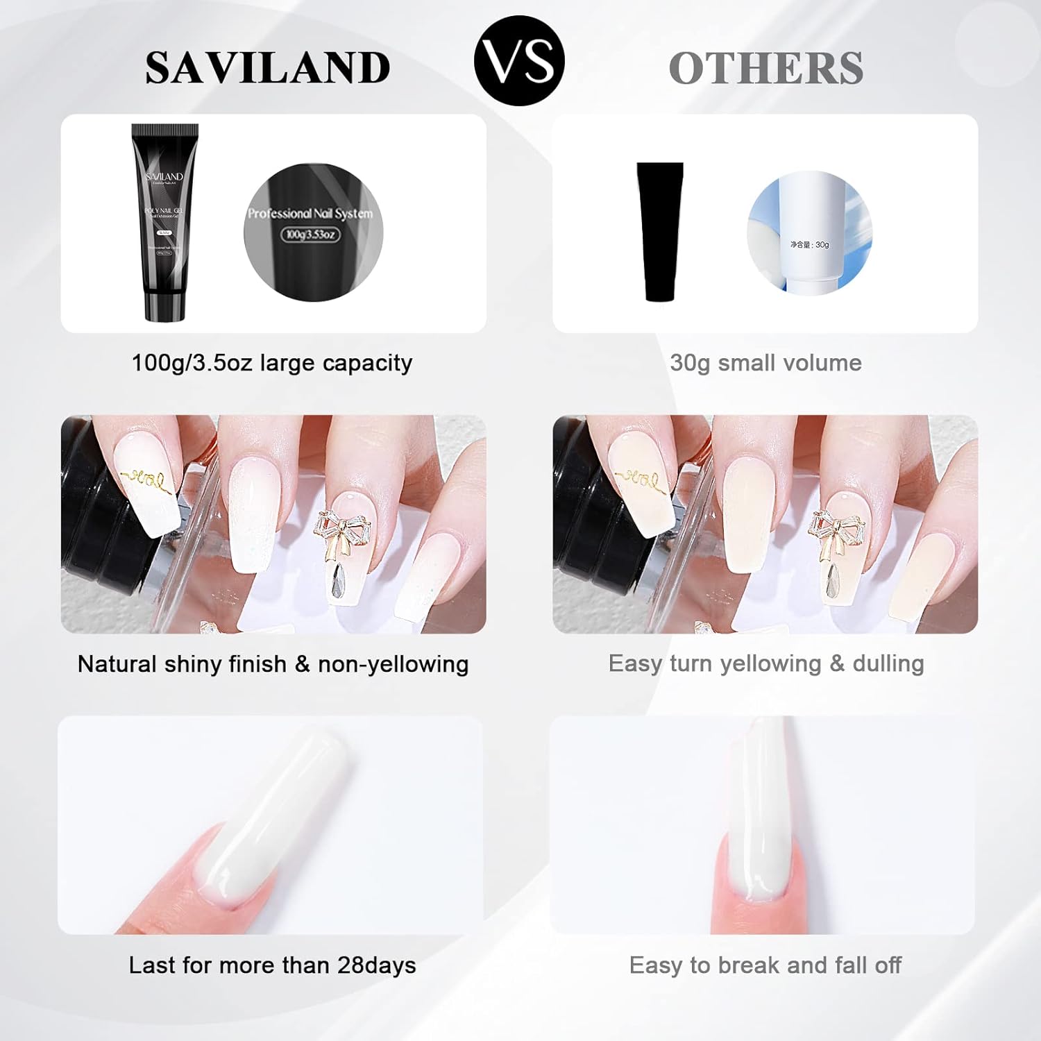 - š· LONG-LASTING & EXQUISITE PACKAGE-Saviland poly gel is durable, the finish effect from poly extension gel can last for more than 21 days. And the packing is high quality, soft hose, sealed and no leaking, easy to squeeze out. And it is also an ideal gift for yourself or your friends who are keen on doing nail designs.