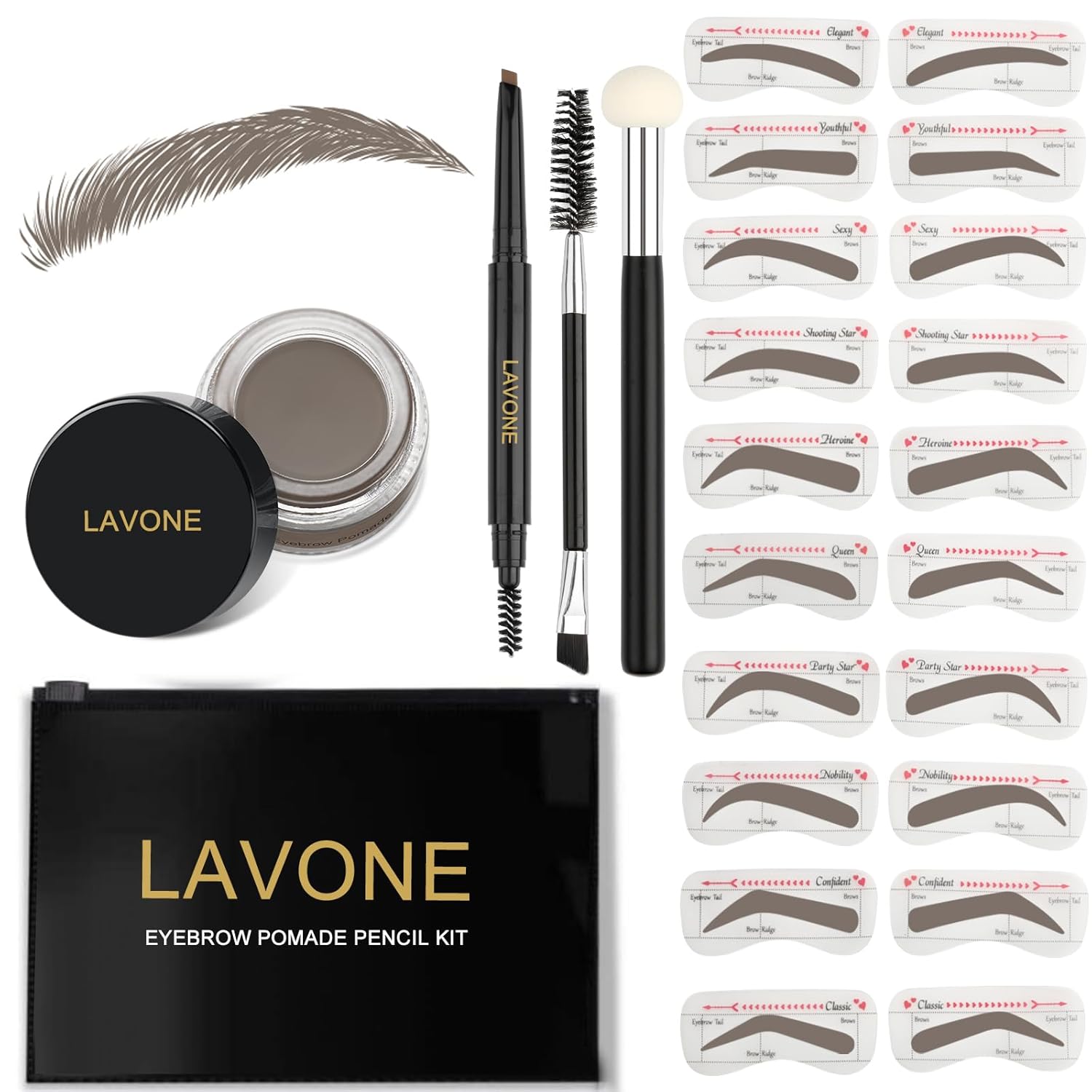 - [Whatβs in the eyebrow kit]: LAVONE makeup eyebrow kit includes brow pencil, eyebrow powder 20 eyebrow stencils (10 different shapes), a sponge applicator, a dual precision brush and a zipper pouch for on the go.